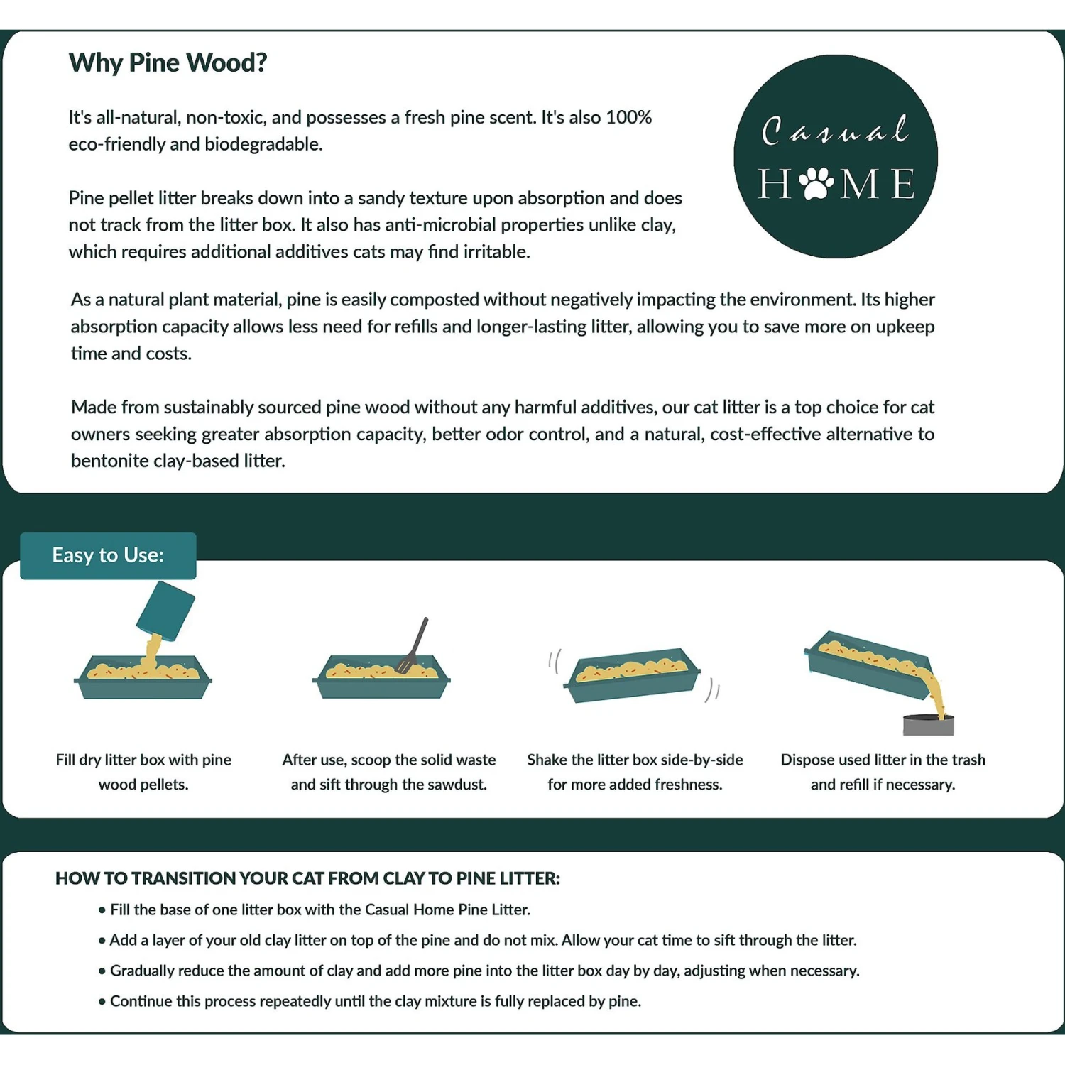 To transition you cat to use Casual Home Pine litter: Fill the base of one litter box with the Casual Home Pine Litter. Add a layer of your old litter on top of the pine litter and do not mix. Allow your cat time to sift through the litter. Gradually reduce the amount of old litter and add more pine litter into the litter box day by day, adjusting when necessary. Continue this process repeatedly until the old litter mixture is fully replaced by the pine litter.