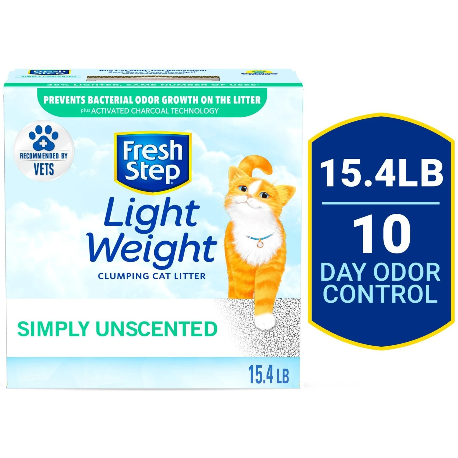 Kick cat-astrophic litter box odors to the curb with Fresh Step Lightweight Simply Unscented Cat Litter. This lightweight litter has no added fragrances or dyes, but still has the same 10 day odor control power as scented cat litter. It’s formulated to prevent bacterial odor growth on litter and features clay, carbon, and minerals working together to stop odors on contact. Your house will smell fur-esh without added fragrance. Plus, it’s 30% lighter–so it’s easier to lift, pour, and store—but still gives you the same number of uses as a 22 pound box. Best of all, the 99.9% dust free formula is designed to stay off your kitty’s paws and help keep your floors clean. This clumping cat litter makes cleanup fast and easy by quickly absorbing liquids, trapping odors, and forming tight clumps—leaving virtually no stinky crumbles after scooping.