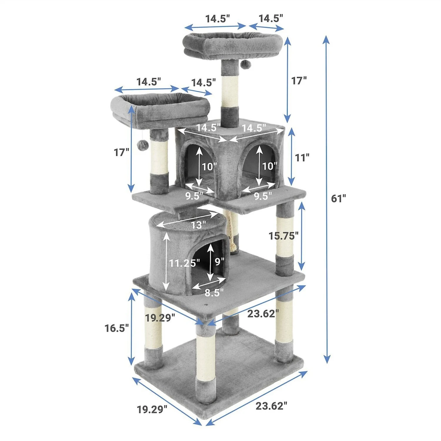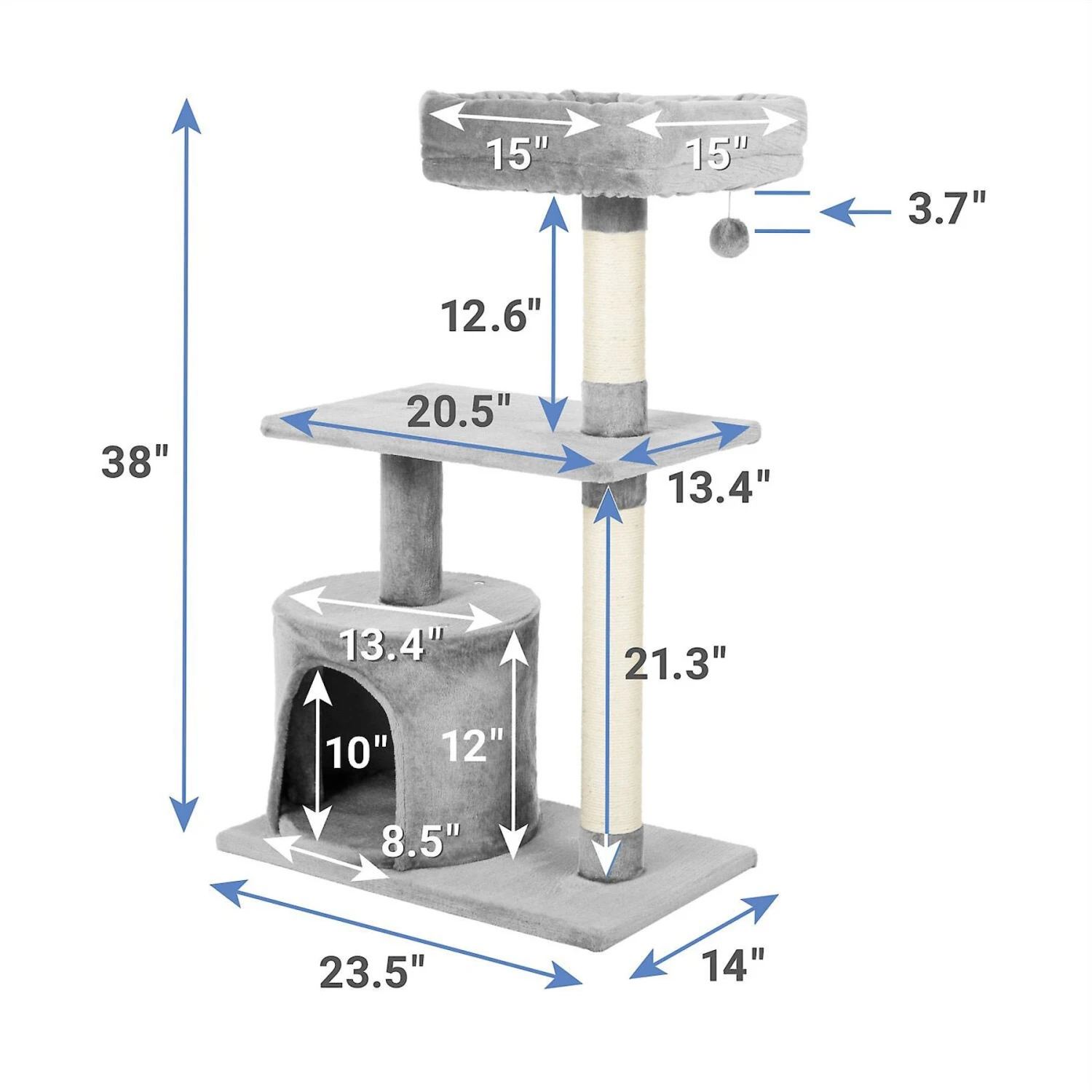 Take your cat tree game to new heights with the Frisco 61-in Faux Fur Tree & Condo, Gray + 38-in Cat Tree & Condo, Top Perch & Toy, Gray. The Frisco 61-in Faux Fur Cat Tree & Condo has one private condo, two top perches—each with a removable, machine-washable bolstered perch cover—sisal wrapped scratching posts, and three built-in toys for some batting fun. The plush fabric throughout feels soft to the touch and adds a luxurious, velvety look. Your cat will love snuggling in one of the bolster beds at the top. When she wants a change of scenery, she can mosey on over to the Frisco 38-in Cat Tree with Condo, Top Perch and Toy. It has three tiers of feline fun and includes a cozy condo and top perch. The sisal scratching posts help promote healthy nails. There’s even a dangling toy to give your kitty the thrill of the hunt as they bat it around. When it’s laundry day, you can easily remove the bolstered perch cover and pop it in the washing machine separately for easy cleaning!