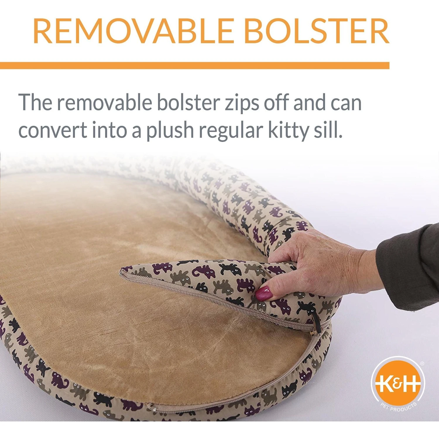 K&H took the popular Kitty Sill to the next level and created both hooded and bolstered kitty sills. The boster is covered with an attractive, poly/cotton kitty print. The inside is lined with soft velvety micro-fleece. The bolster zips off and can convert into a plush kitty sill. The hood offers security and your kitty can still see all the views to the outdoors. If your kitty wants to cuddle, they can have all the advantages of looking out the window and feeling the sunshine while having the security of a bolster.