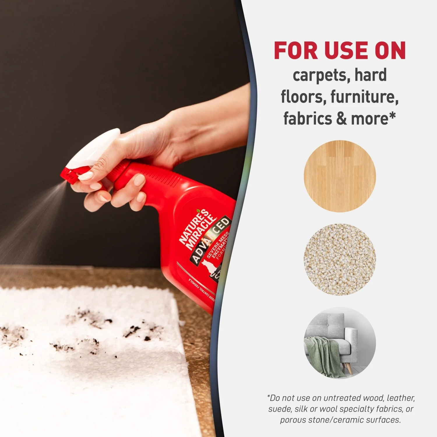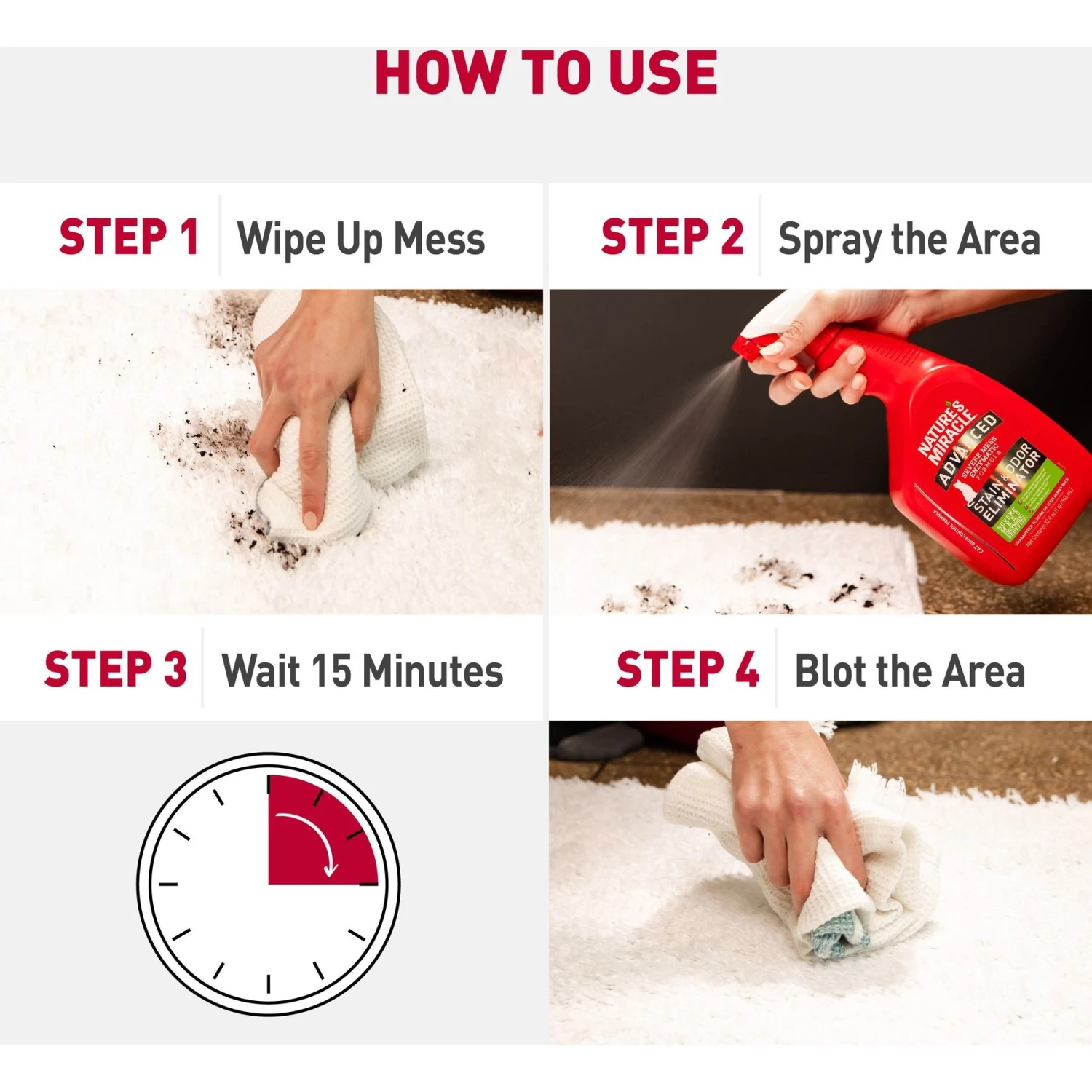 Nature’s Miracle Just for Cats Advanced Stain and Odor Remover works to discourage re-soiling by removing the odor of pet messes. The bacteria-based formula produces enzymes to target severe cat messes including urine, diarrhea, vomit and blood. The Stain and Odor Eliminator is safe to use on carpets, hard floors, furniture, fabrics and more, when used as directed, and leaves you with a light fresh scent.