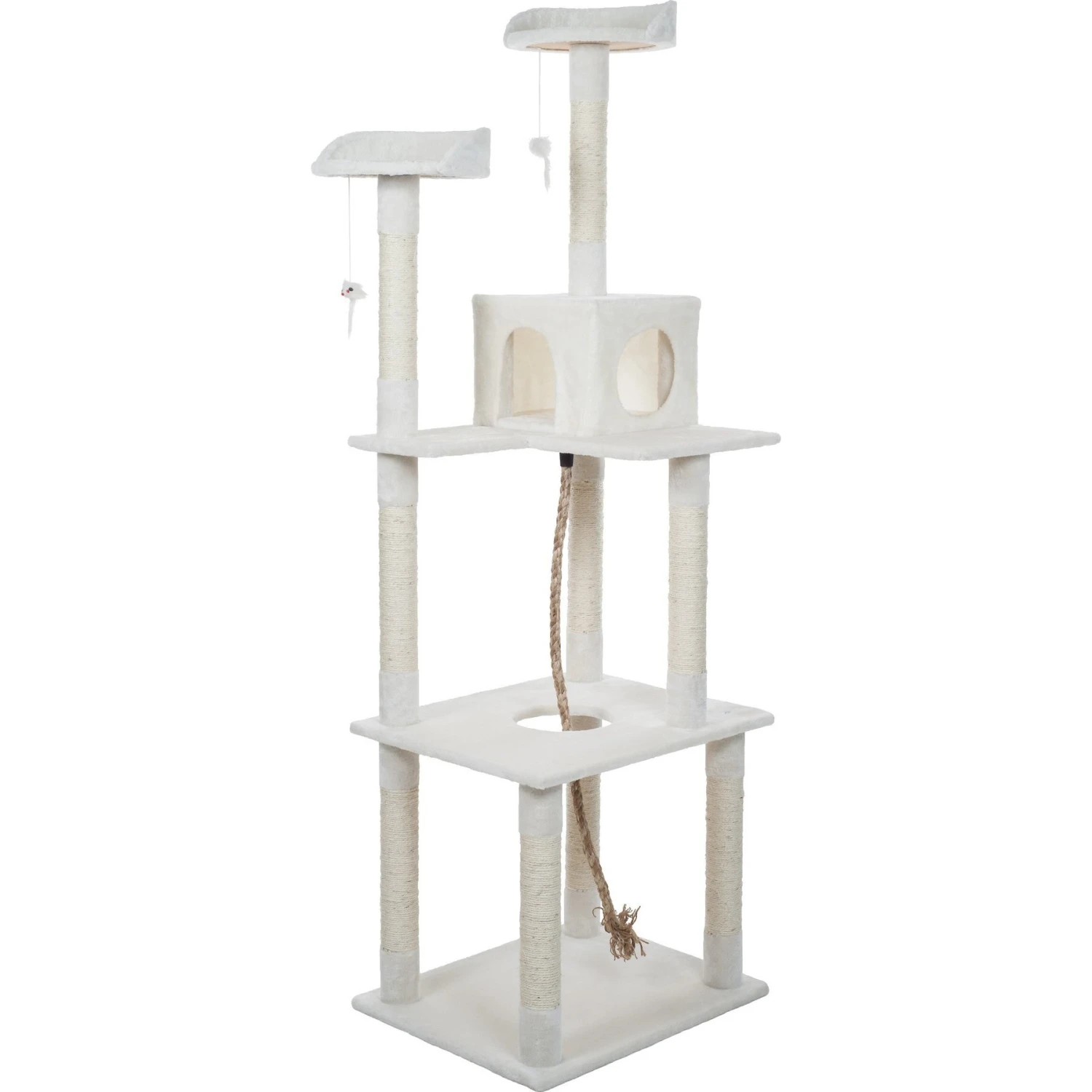 - The multi-level climbing structure is constructed of wood, plush white carpet and pet-safe sisal rope.