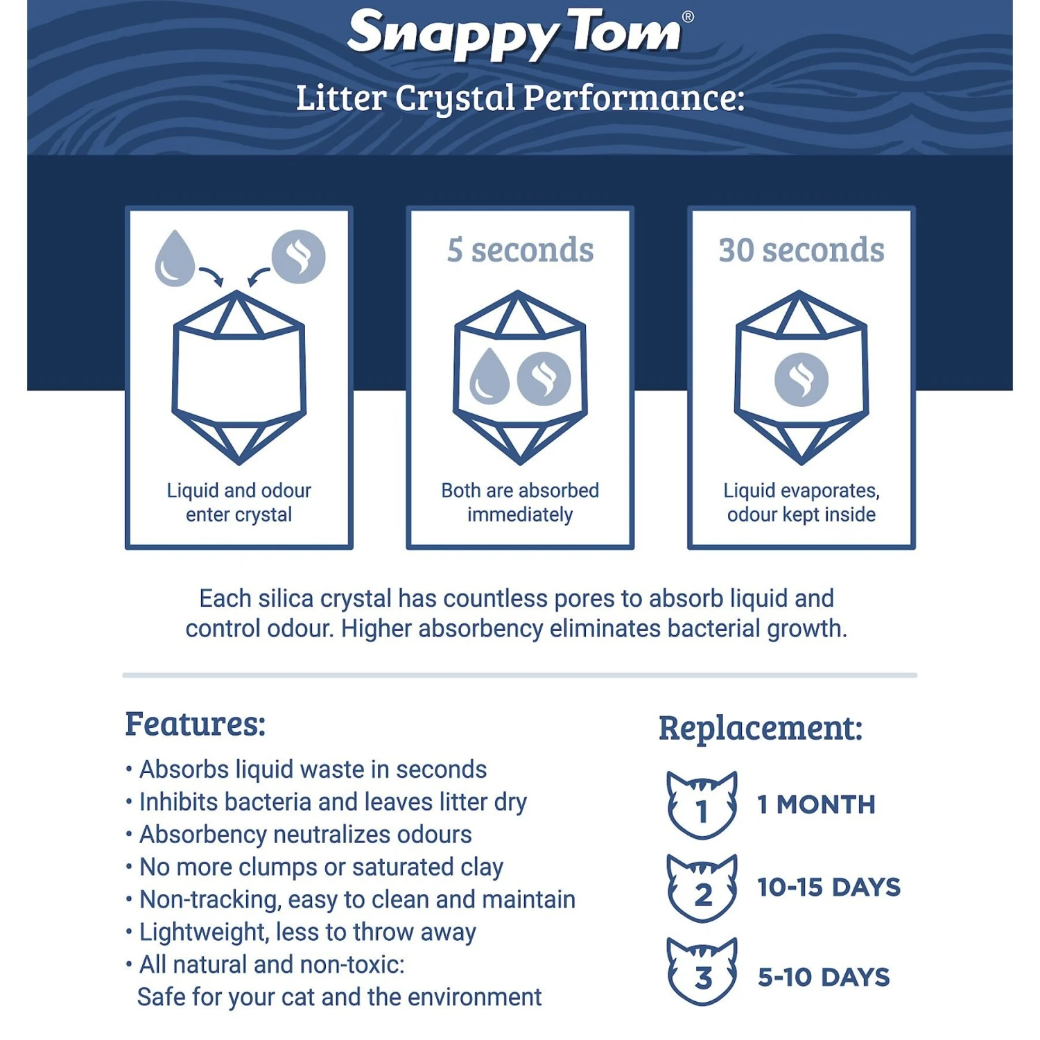 - Non-tracking—made with lightweight, absorbent crystals.