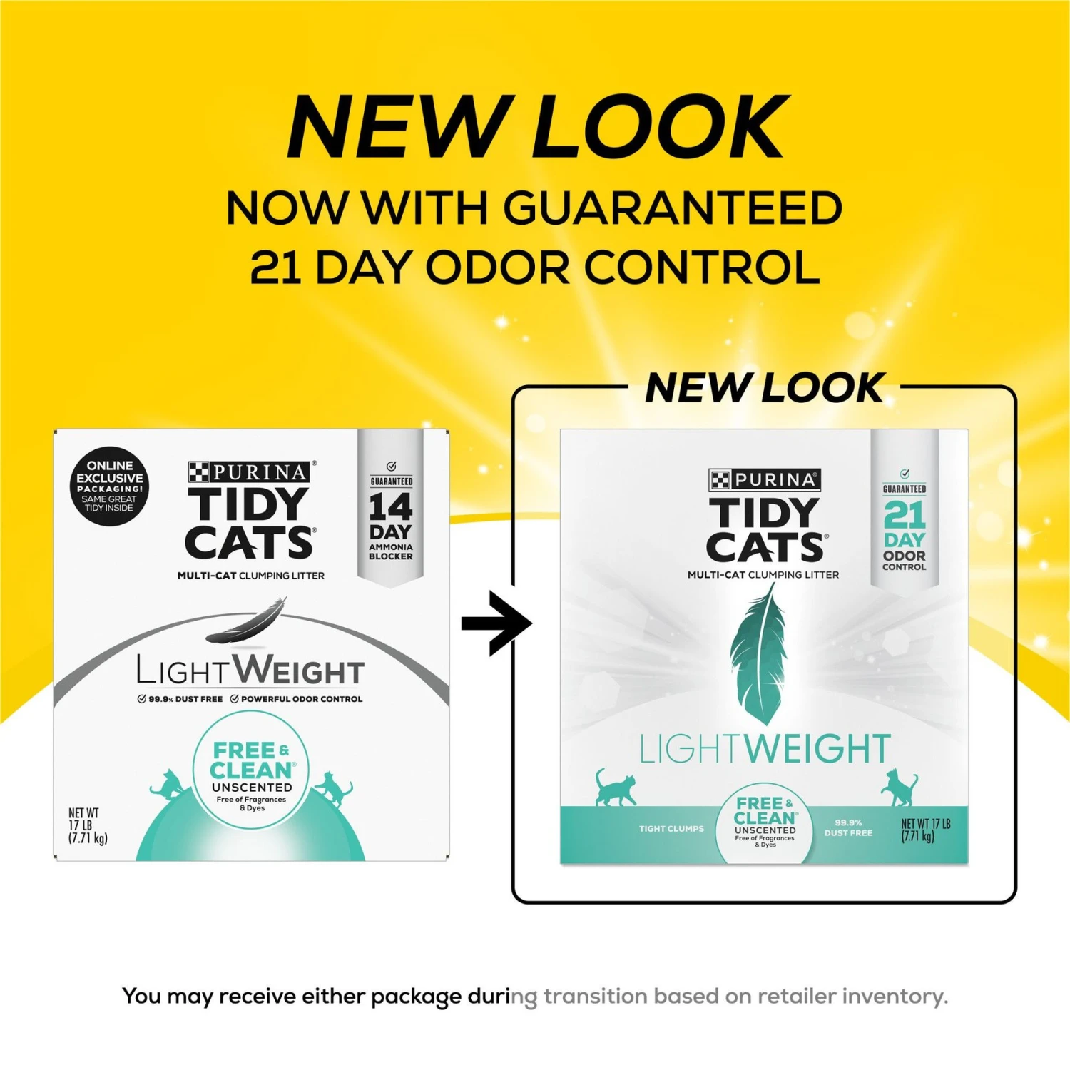 Win the war against litter smells with Purina Tidy Cats LightWeight Free & Clean Unscented With Ammonia Blocker Clumping Multi Cat Litter. This unscented cat litter steps up to meet the needs of both you and your feline friends. The lightweight cat litter has absolutely no fragrances or dyes, and it’s low dust to pour easily into the litter box. Activated charcoal in the clay cat litter absorbs odors on contact, while an Ammonia Blocker stops ammonia odor in its tracks for 14 days when used as directed. The odor control cat litter helps keep your home smelling fresh, and it helps lock in moisture, keeping your furry family comfy too. Weighing half as much as the leading clay clumping cat litter, Tidy Cats lightweight cat litter is also easy to carry, pour and store. Taking care of the litter box is a snap when you use this unscented lightweight cat litter for your whole cat family. It’s made by Tidy Cats, the brand most often recommended and personally used by veterinarians.