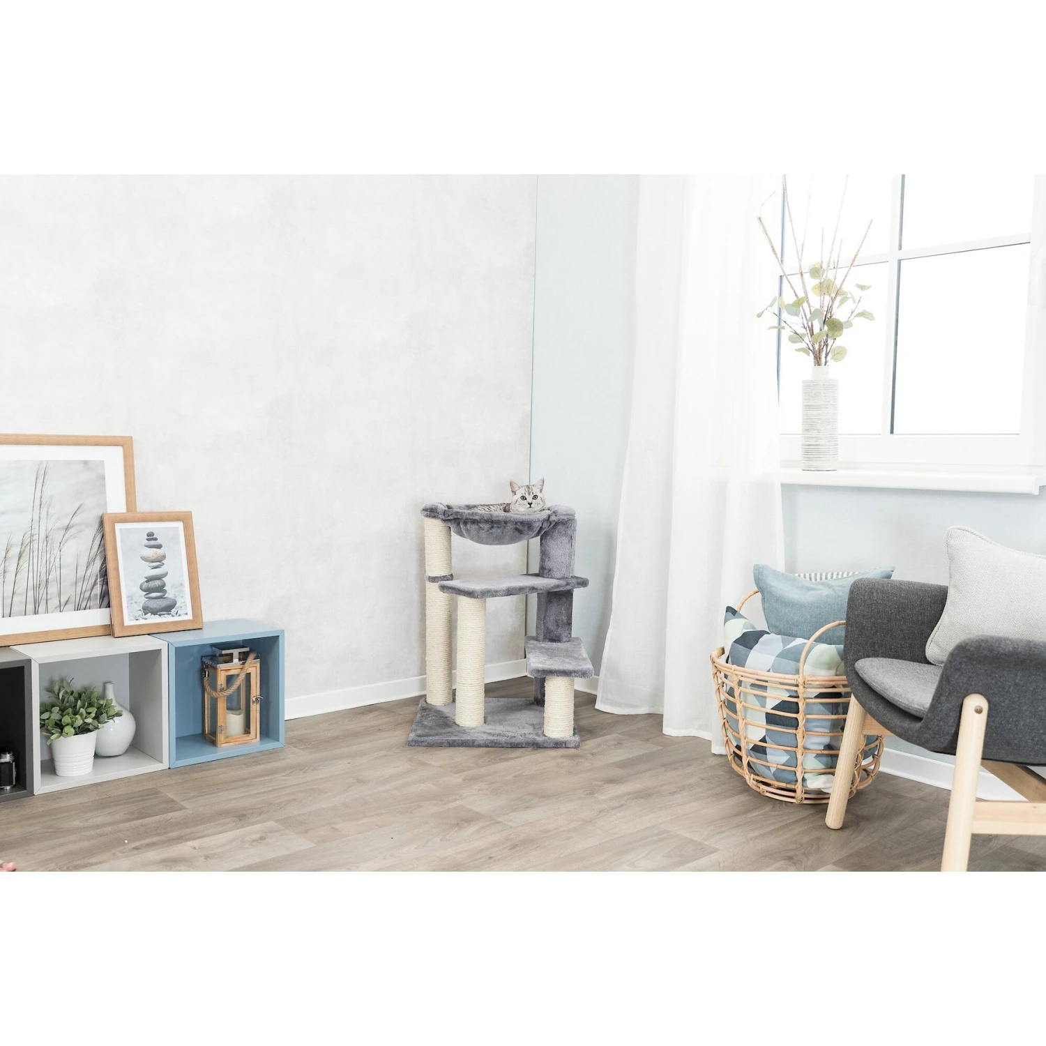 - Jute-wrapped posts help satisfy your feline friend’s instinctual need to scratch.