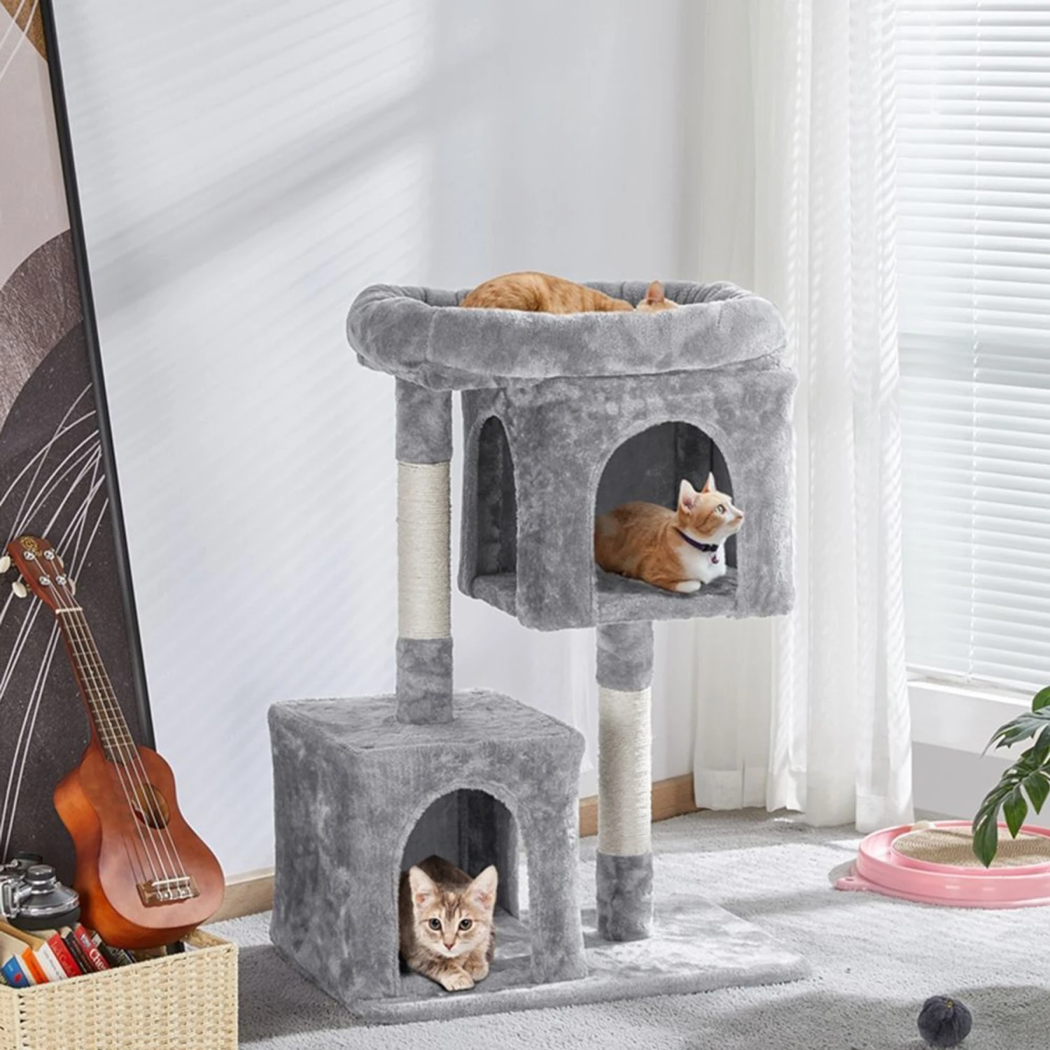 - Features two cozy condos with doors and a plush nest, which are purr-fect for some alone time.