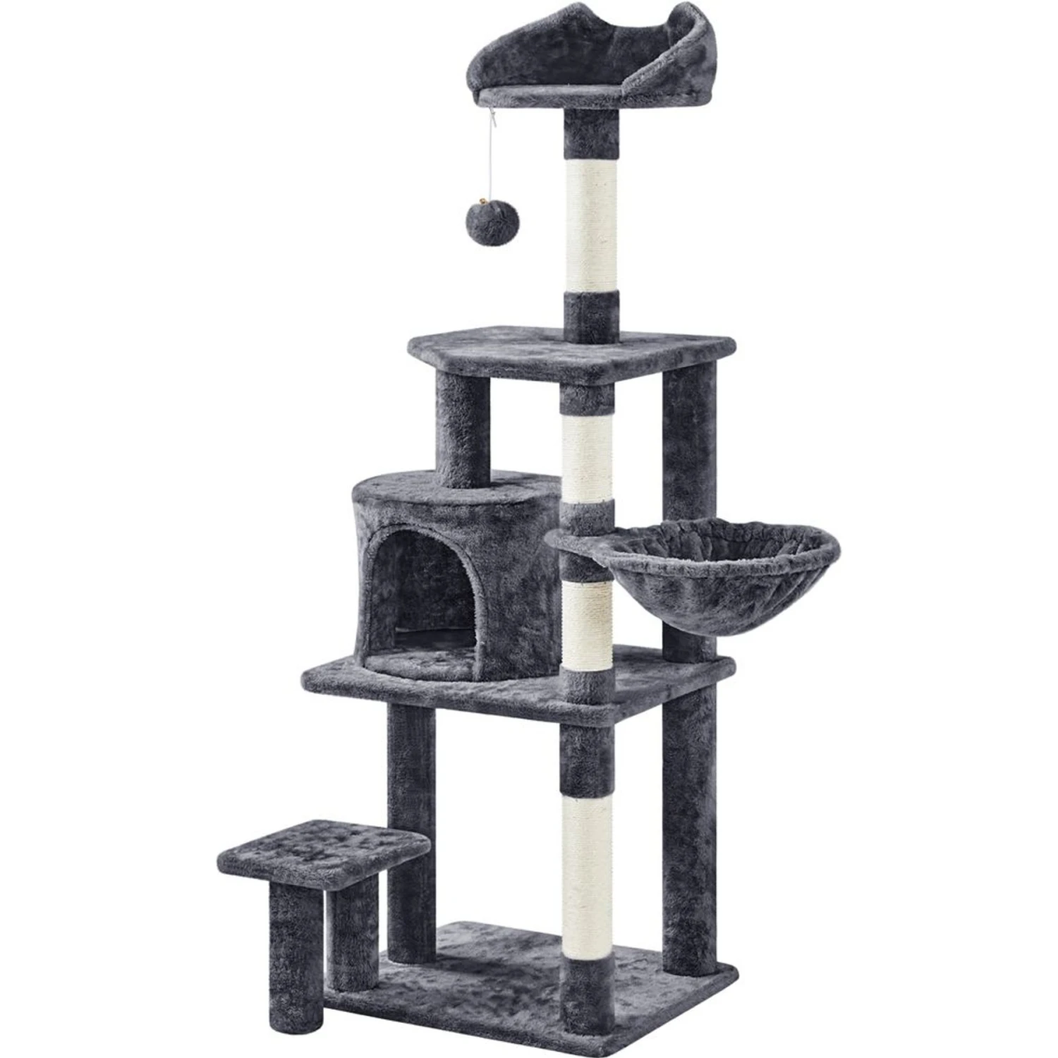 Keeping your cats entertained when you’re away from home is in your best interest and theirs—that’s where the Yaheetech Play Center 60.5-in Plush Cat Tree comes in. This medium-sized cat tree includes several perches, hanging toys, and a central hole in which to climb and hide. The combination of sturdy and soft materials will ensure longevity of play and comfort for your cats.