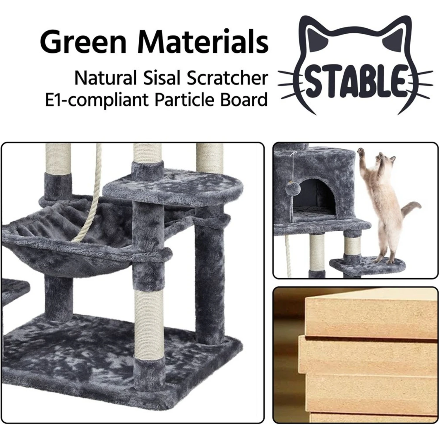- 12 sisal scratching posts at different heights can satisfy several cats at once and save your furniture from sharp kitty claws, while jingly furballs and sisal twine are there for feline entertainment.